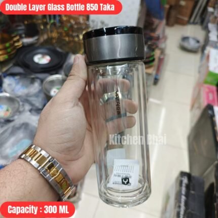 Double Layer Glass Water Bottle- Silver Black Cap 300ml