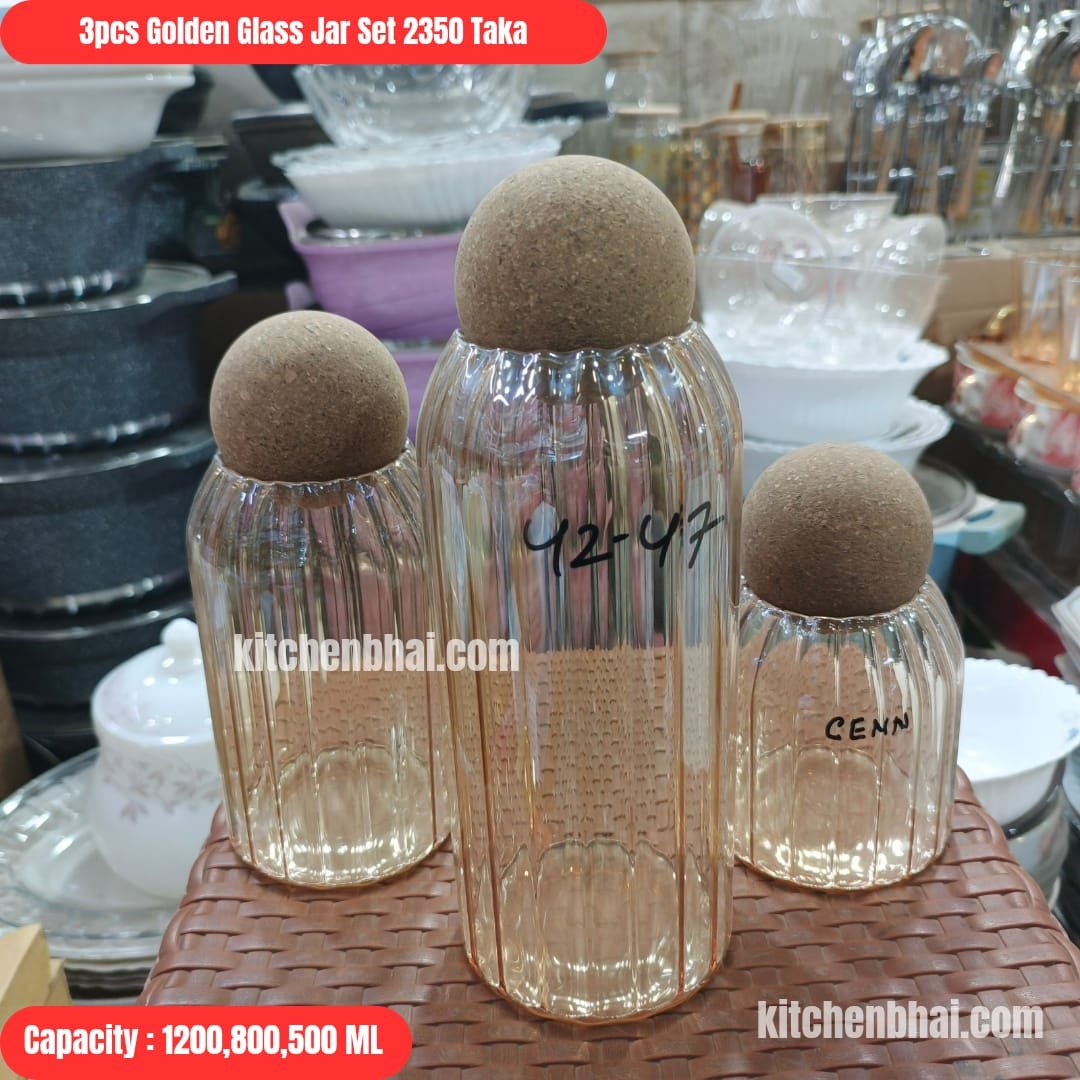 3pcs Golden Glass Jar Set With Wooden Ball Lid