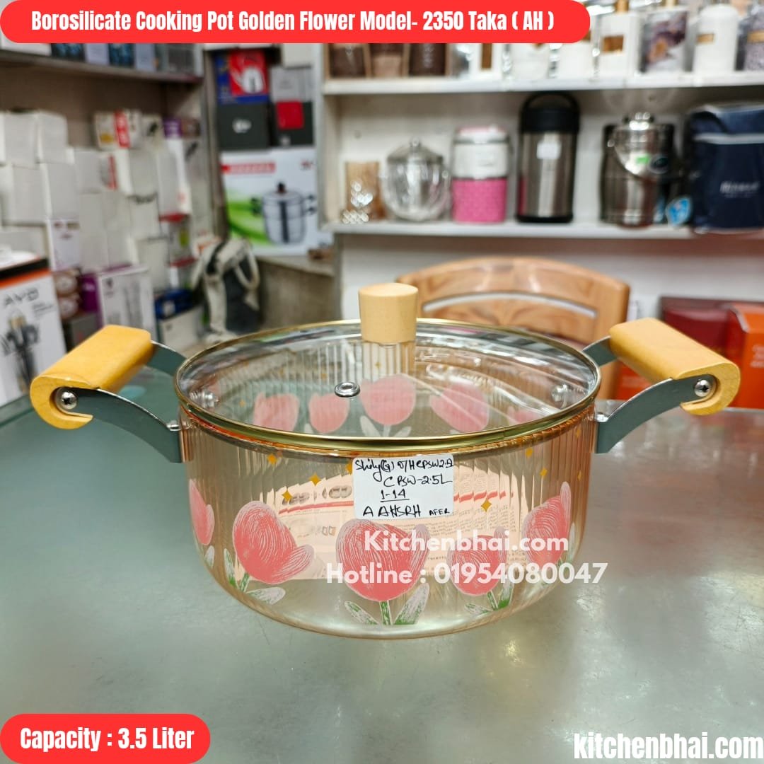 Borosilicate Glass Cookware- Golden Flower Model Cooking Pot with Lid- 3.5 Liter-AH