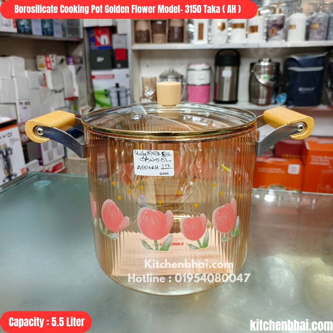 Borosilicate Glass Cookware- Golden Flower Model Cooking Pot with Lid- 5.5 Liter-AH