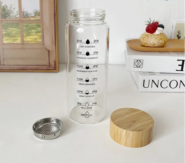 Borosilicate Glass Water Bottle with Bamboo Lid with Time Marker