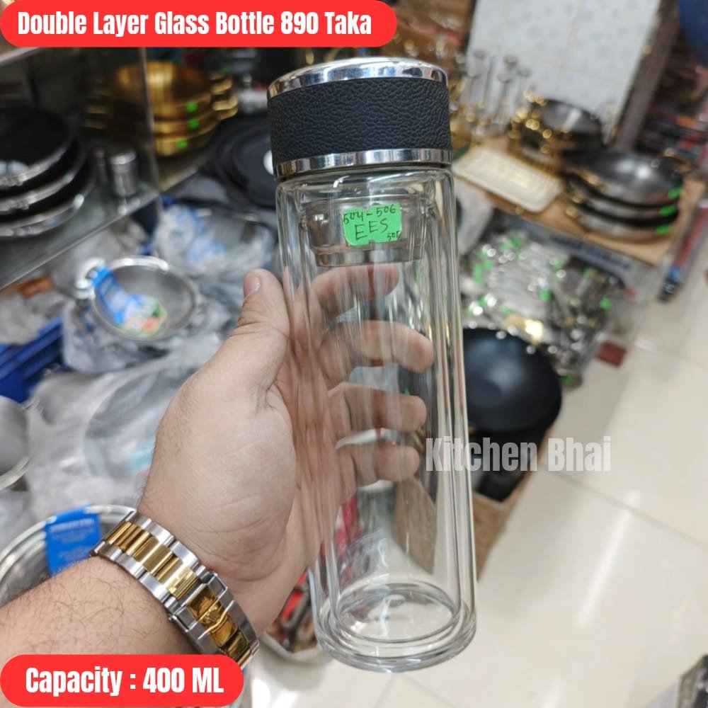 Double Layer Glass Water Bottle- Silver Cap with Handle – 360ml