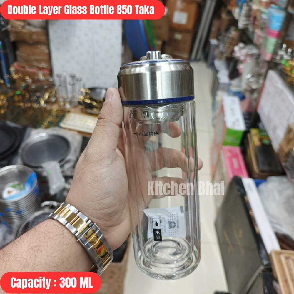 Double Layer Glass Water Bottle- Silver Cap 300ml