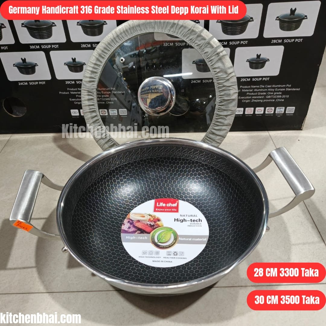 Germany Handicraft 316 Grade Stainless Steel Deep Korai With Lid