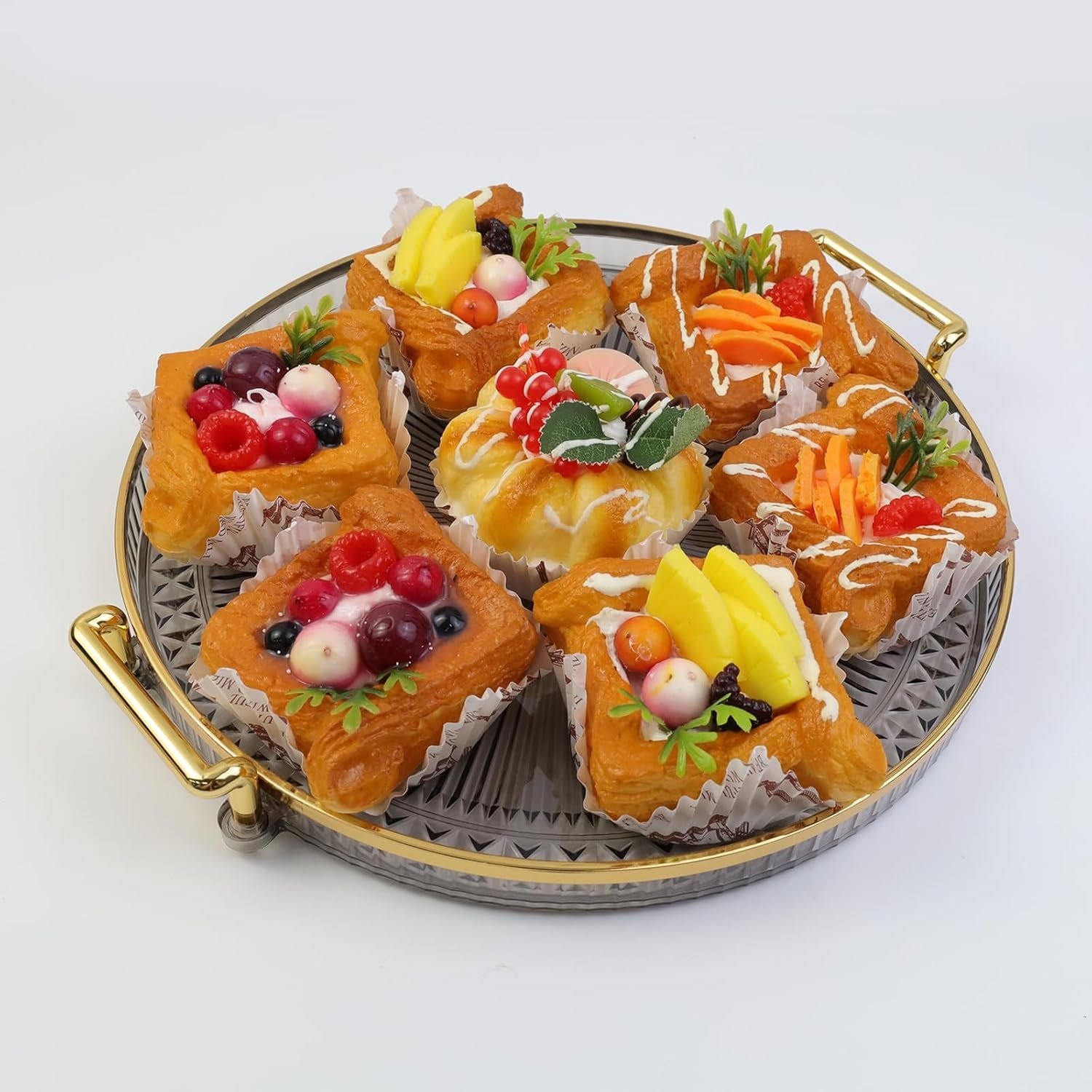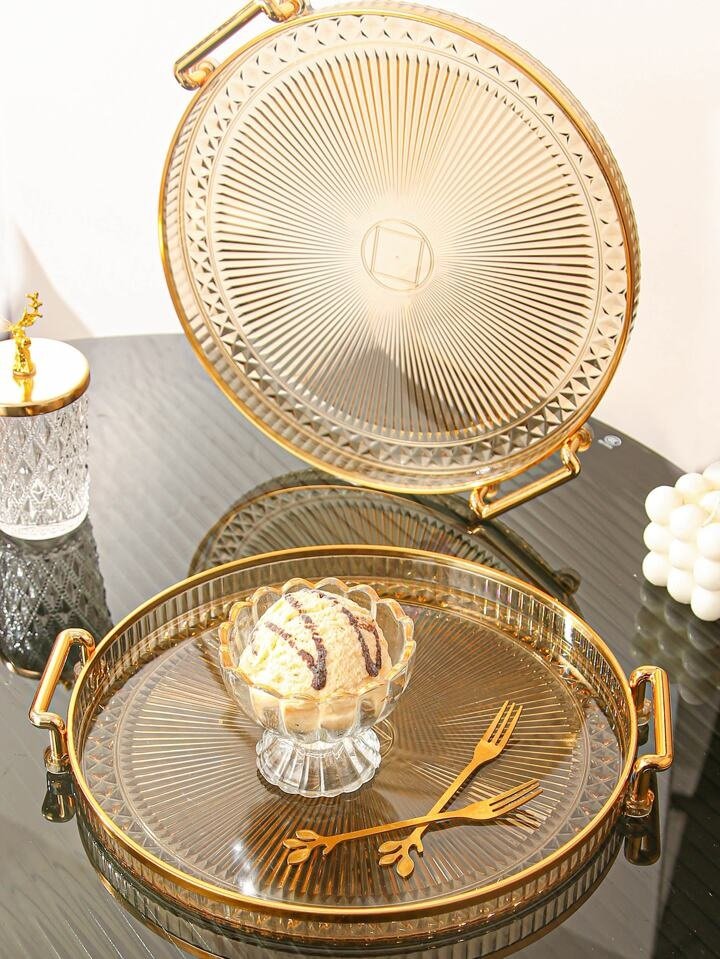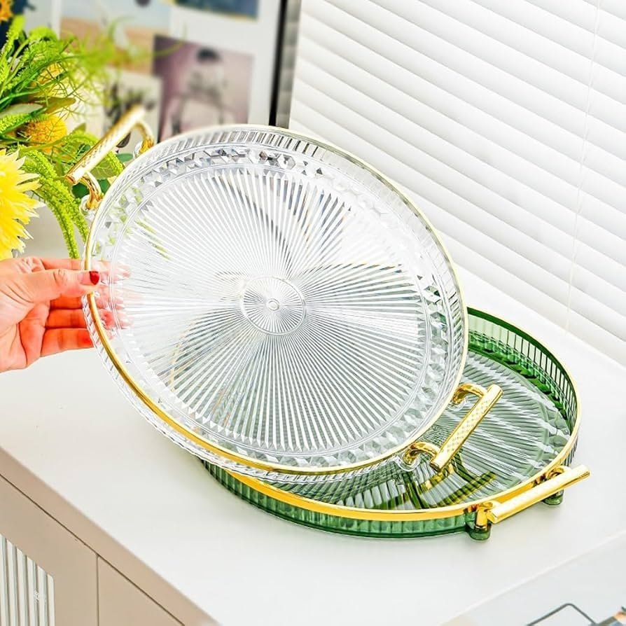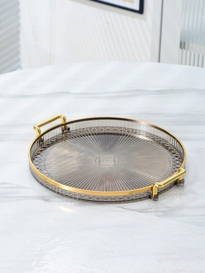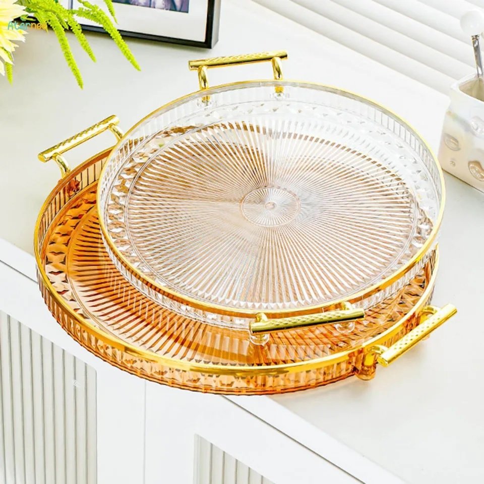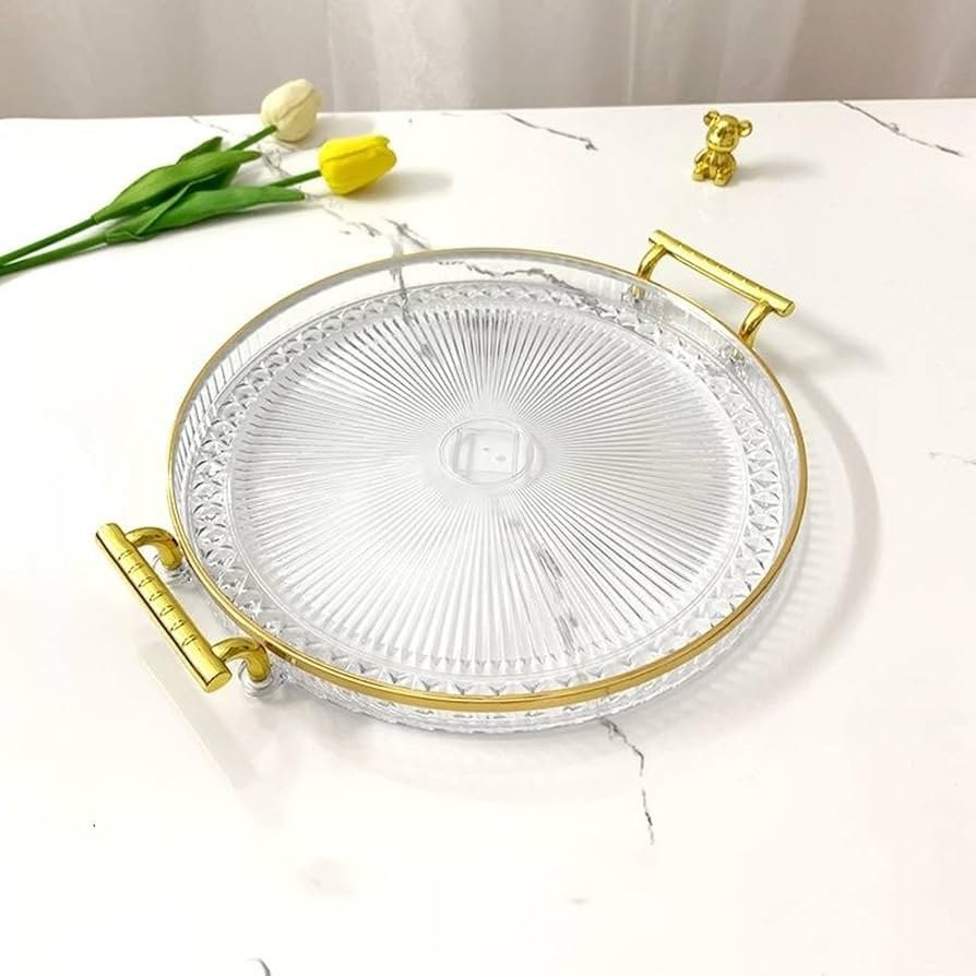 Luxury Elegant Gold Lining Striped Round Decorative Serving Tray with Handles